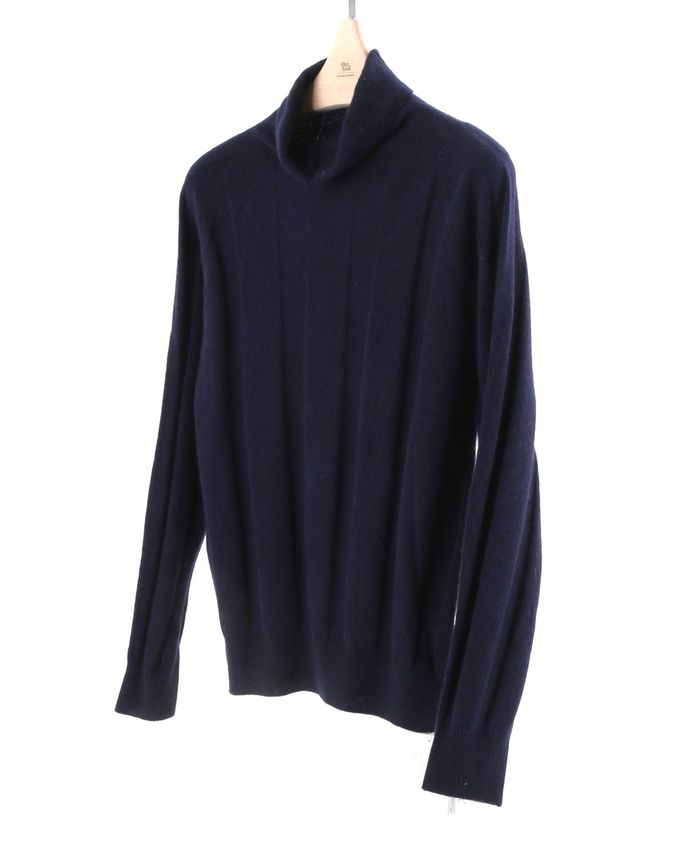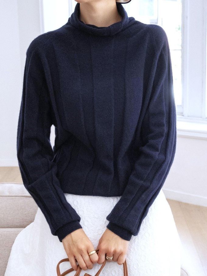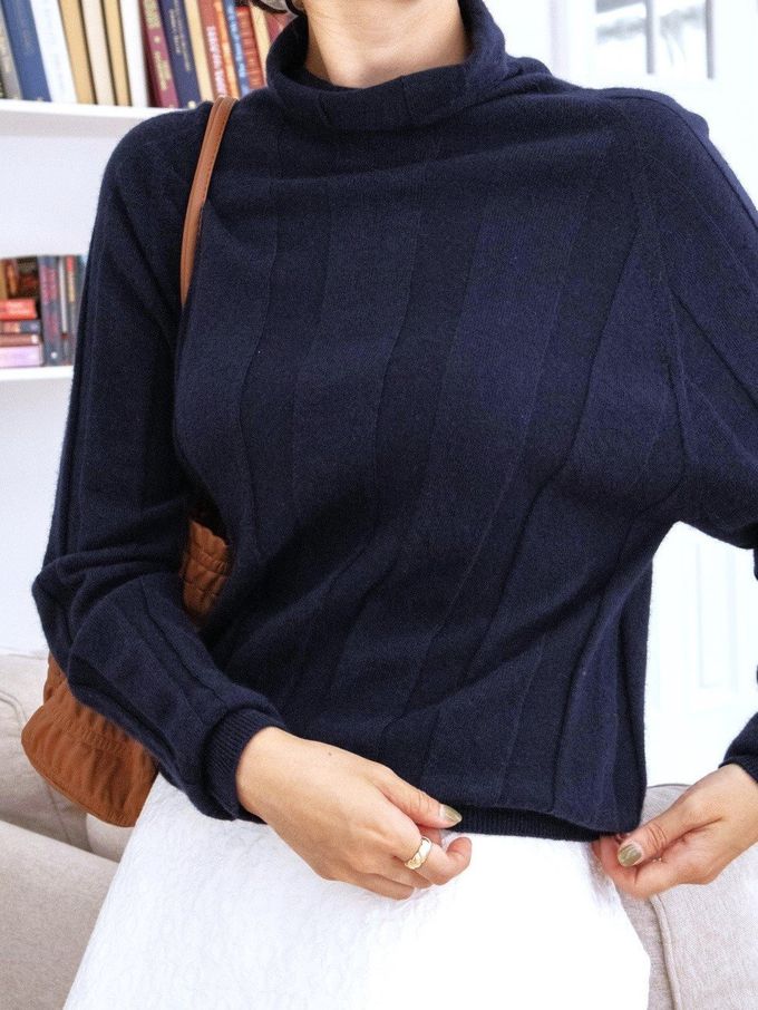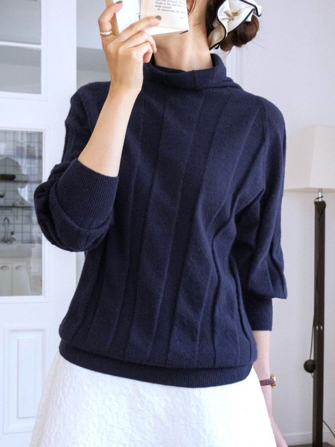 韓國女裝連線 - 輕暖美麗諾羊毛坑條針織長袖高領上衣-海軍藍 (FREE)
