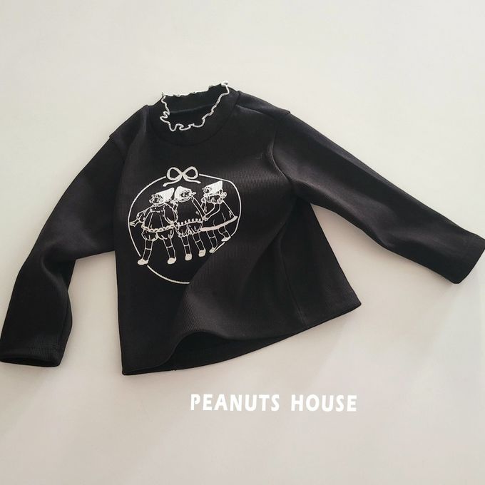 韓國南大門童裝 - Peanuts House 尖帽少女圖案木耳邊領長袖上衣-黑
