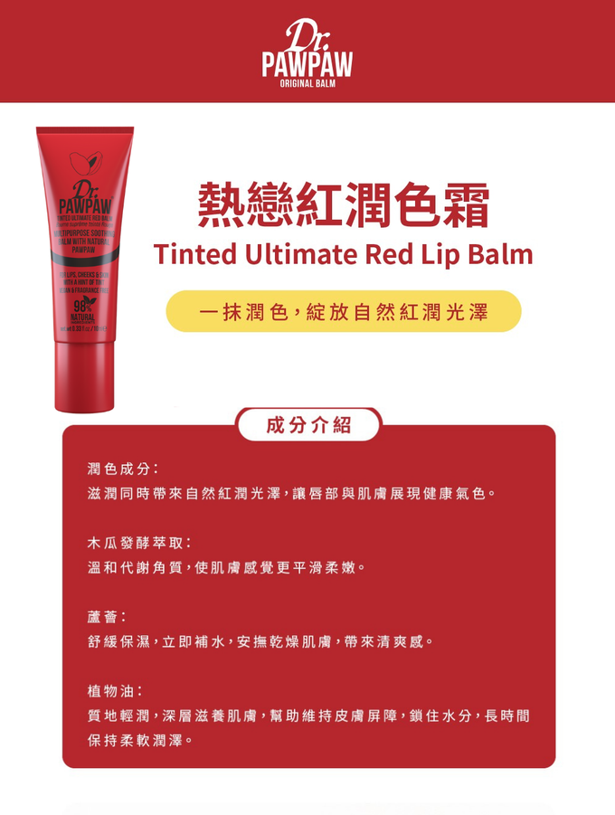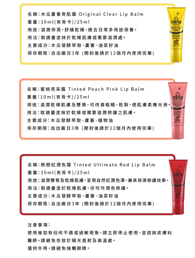 品名:護唇膏 多功能萬用膏 經典木瓜蘆薈(原味) + 蜜桃粉 + 極致紅