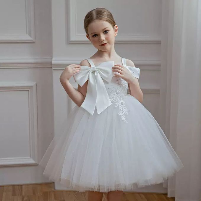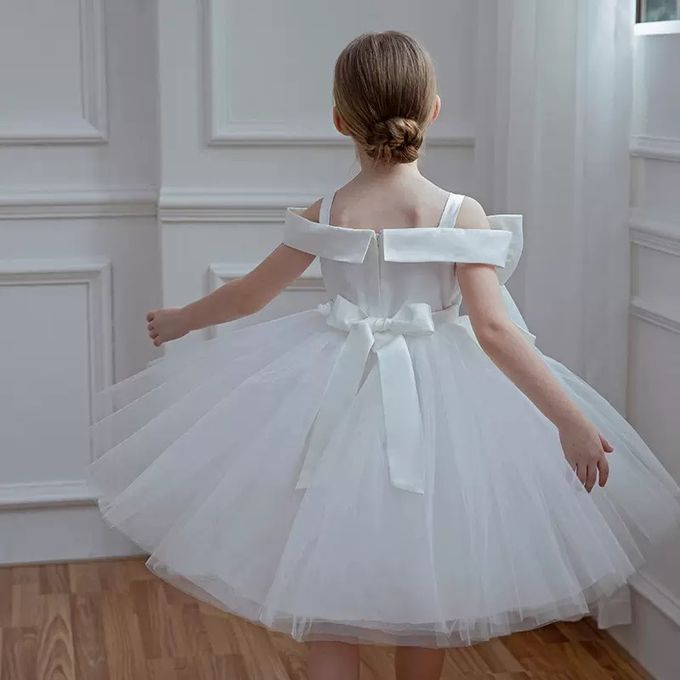 歐美氣質立體蝴蝶結肩帶平口純白紗小禮服