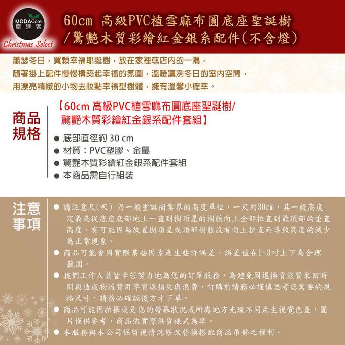 品名:60cm(2尺)高級PVC植雪麻布圓底座聖誕樹+驚艷木質彩繪紅金銀系配件/不含燈/本島免運費/歐美外銷人氣款