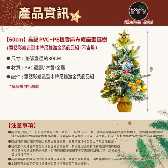 品名:60cm(2尺)高級PVC植雪麻布圓底座聖誕樹+童話彩繪木牌吊飾漾金系飾品組/不含燈/本島免運費/歐美外銷人氣款