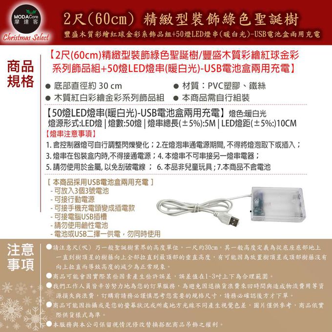 品名:台灣製2尺(60cm)精緻裝飾綠色聖誕樹+豐盛木質彩繪紅球金彩系飾品組+50燈LED燈串暖白光-USB電池盒兩用充電/本島免運費/歐美外銷款