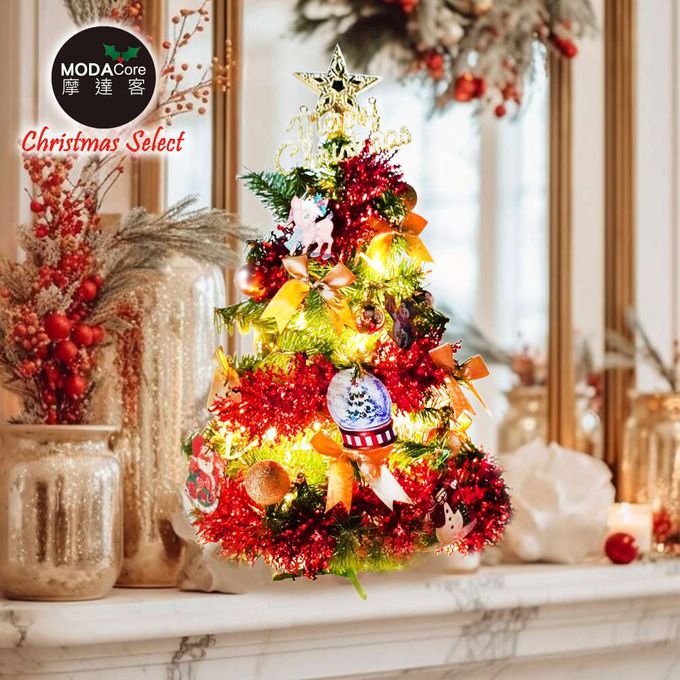 台灣製2尺(60cm)精緻型裝飾綠色聖誕樹+童話彩繪木牌水晶球紅金系列飾品組+50燈LED燈串暖白光-USB電池盒兩用充電/本島免運費/歐美外銷款