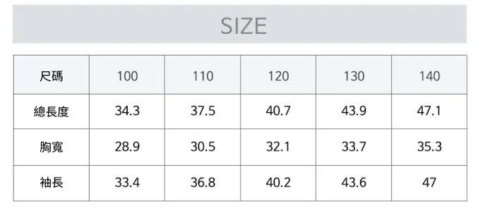 1. 尺寸表單位皆為公分(cm),實際尺寸會因布料彈性、水洗、測量起迄點等因素略有誤差。