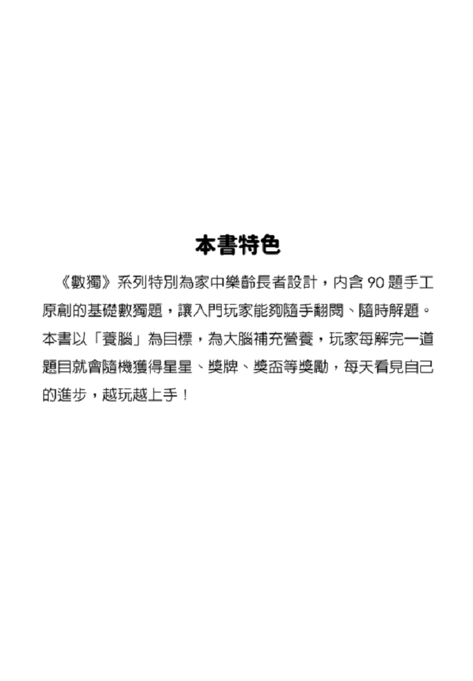 不怕年紀大,只怕腦袋不動它!《數獨》系列特別為家中樂齡長者設計,內含90題手工原創的基礎數獨題,讓入門玩家能夠隨手翻閱、隨時解題。玩家每解完一道題目就會隨機獲得星星、獎牌、獎盃等獎勵,每天看見自己的進步,越玩越上手!玩家可以依照自己的喜好,挑選喜歡的主色,挑戰精選的90道數獨題;也可以一次收藏系列三本,一本本解完所有題目,化身終極數獨達人。