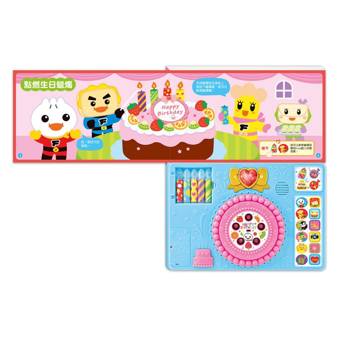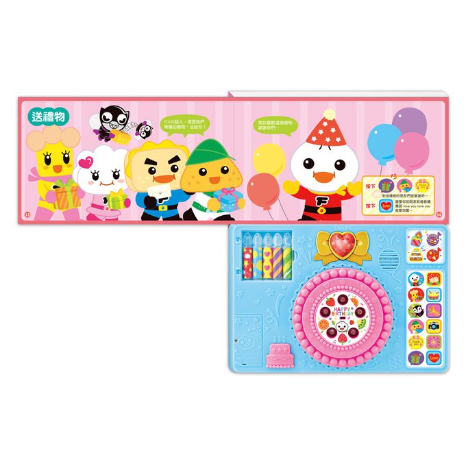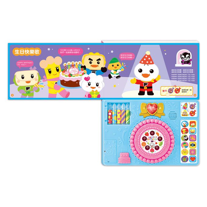 跟著FOOD超人一起過生日、吹蠟燭吧!將閃亮蠟燭放到蛋糕上還會有明亮的燈火!讓孩子開開心心學唱歌。家長也可以和孩子一起遊戲、一起遊玩生日派對的情境角色扮演,強化親子關係,增進感情!