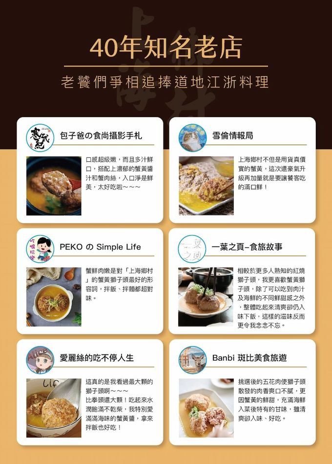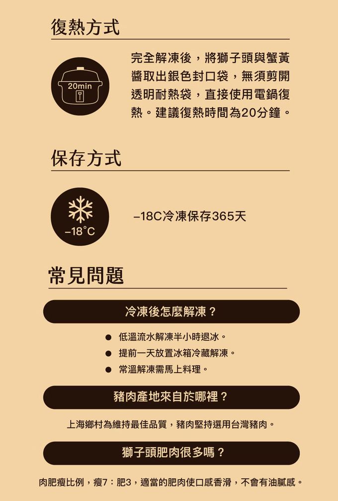 成分:豬肉(台灣)、荸薺、洋蔥、薑、蔥、雞蛋、豆腐(水、黃豆(非基因改造)、葡萄糖酸δ-內酯、氯化鎂、脂肪酸甘油脂、碳酸鈣、卵磷脂、葡萄糖酸δ-內酯、氯化鎂、乳化劑(脂肪酸甘油酯、碳酸鈣、卵磷脂))、扁蟹肉、紅蘿蔔、洋蔥、鴨蛋、沙拉油(大豆油)、辣椒、八角、調味劑(Lー麩酸鈉)、鹽、米酒(米、蔗糖、水)、紹興酒、糖、醬油(大豆、小麥、食鹽、砂糖、調味劑(L-麩酸鈉、胺基乙酸)、著色劑(焦糖色素)、甜味劑(甘草酸鈉))、水、太白粉(樹薯澱粉)