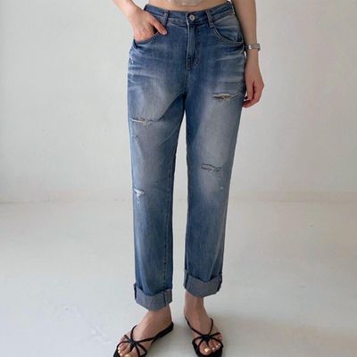 韓國女裝連線 - (Cool Max)彈性腰夏日適穿寬鬆丹寧褲-中青